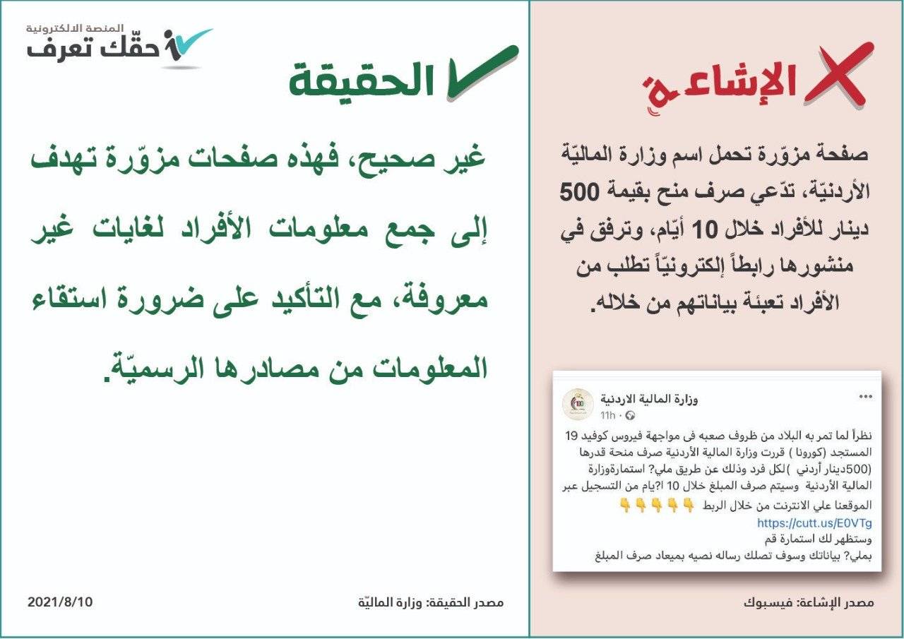 وقالت الحكومة إن صفحة مزورة تحمل اسم وزارة الماليّة الأردنية، تدعي صرف منح بقيمة 500 دينار للأفراد خلال 10 أيام.