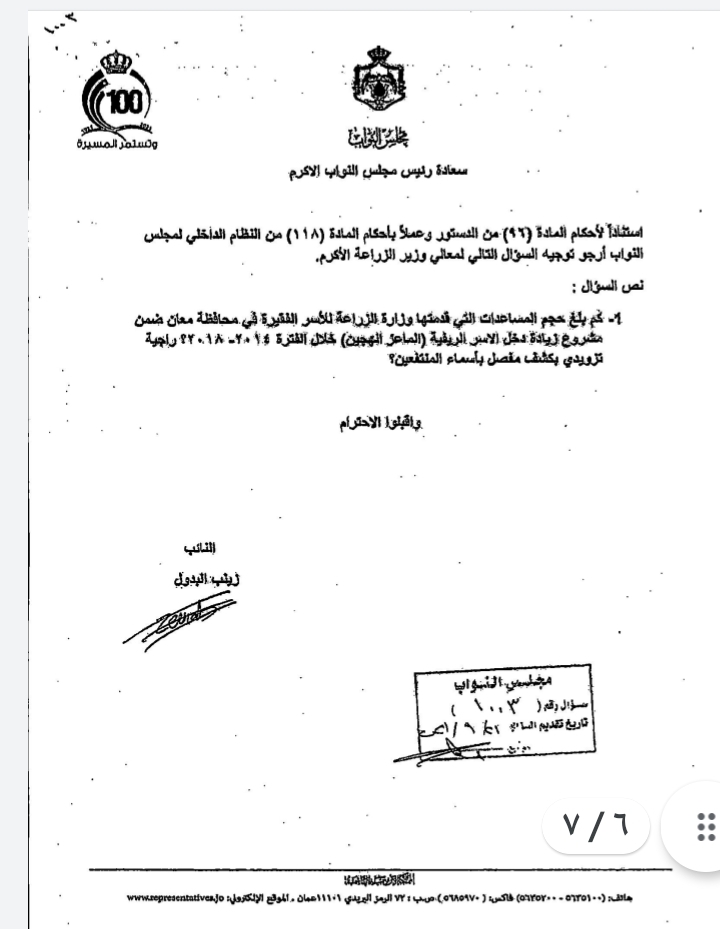 النائب البدول تطالب الزراعة بزيادة دعم الاسر الريفية الفقيرة في معان