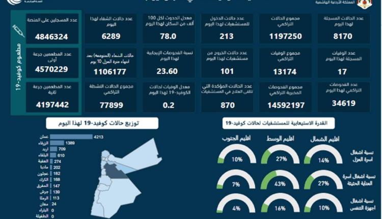 تسجيل 17 وفاة و8170 إصابة جديدة بكورونا ونسبة الفحوص الإيجابية 23.60% السبت