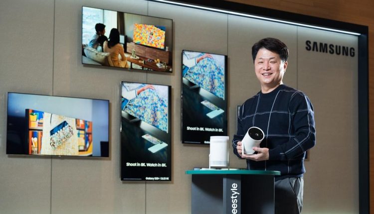 جونغراي كيم من وحدة أعمال الشاشات في سامسونج للإلكترونيات يعرض بفخر The Freestyle، الشاشة المحمولة الجديدة التي تم تقديمها في المعرض.