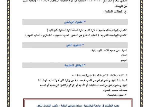 FW: جامعة فيلادلفيا تعلن بدء استقبال طلبات التفوق الرياضي والفني