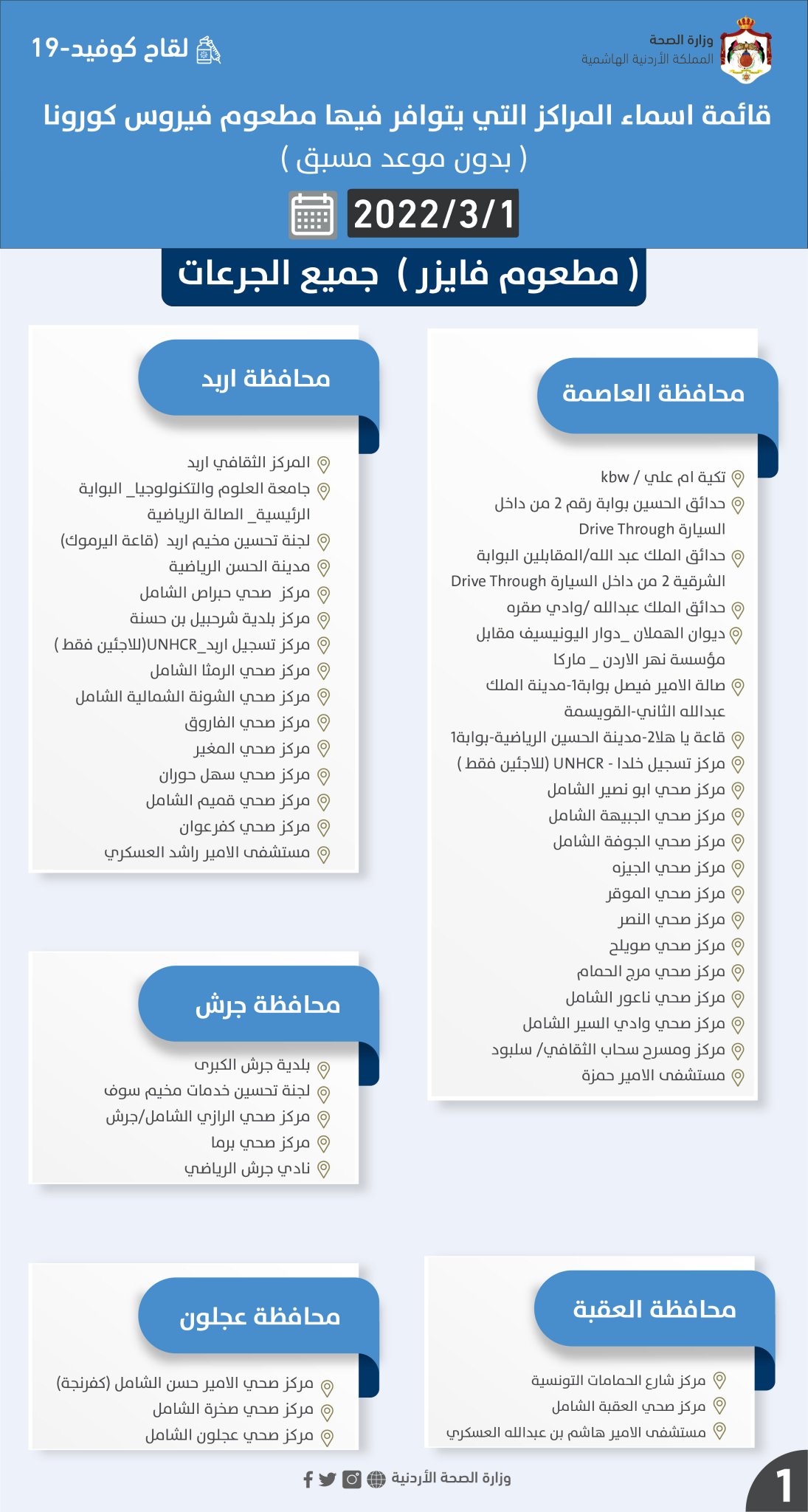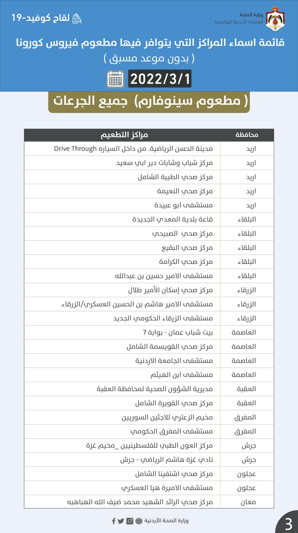 أسماء المراكز التي يتوافر فيها مطعوم كورونا اليوم الثلاثاء..2022/3/1