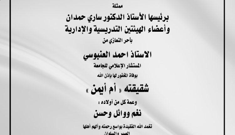 للجامعة ” بوفاة المغفور لها بإذن الله شقيقته” أم أيمن ” وعمة كل من أولاده : نغم ووائل وحسن .. تغمد الله الفقيدة بواسع رحمته وألهم أهلها الصبر والسلوان …إنا لله وإنا إليه