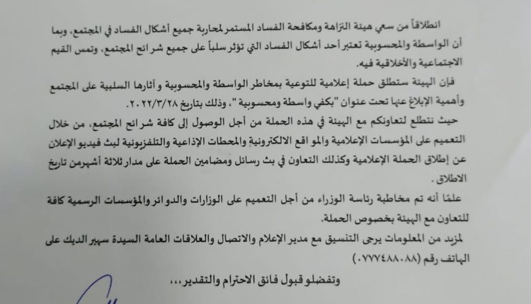 واطلق مجلس الهيئة عن هذه الحملة التي عنوان بشعار “بكفي واسطة ومحسوبية” وتستمر مدة ثلاثة أشهر، أنها إعمال لمساعيها المستمرة في محاربة جميع أشكال الفساد ونشر قيم النزاهة، مستذكرًا نص المادة 16 من قانون النزاهة ومكافحة الفساد رقم 13 لسنة 2016 وتعديلاته التي تجرم الواسطة والمحسوبية التي تلغي حقًا وتُحق باطلًا.