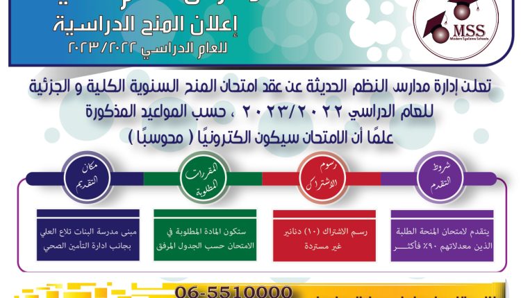 حصاد نيوز _ تعلن مدارس النظم الحديثة بأن يوم الاثنين الموافق 27-6- 2022 الساعة التاسعة صباحًا سيكون موعدًا نهائيًا استدراكيًا لمن لم يتمكنوا من التقدم لامتحان المنحة الدراسية في موعدها للعام 2022-2023 ويشمل ذلك طلاب وطالبات الصفوف من السابع حتى الأول الثانوي العلمي والأدبي.