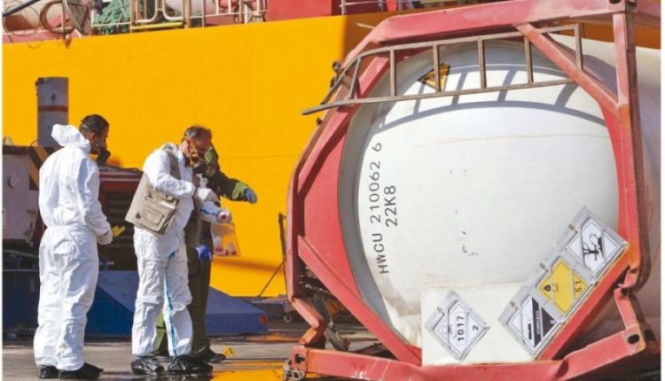 ومع بداية دوام الشفت الثاني، الذي بدأ دوامه الساعة الثالثة مساءً، بدأت الشاحنات المحملة بالحاويات، الدخول إلى الميناء على الرصيف المذكور، قبالة الباخرة، مع الإشارة أن تلك الشاحنات، كانت قادمة من عمان، منطقة الموقر، من مصنع الشركة الوطنية لصناعة الكلورين، ومنظم فيها معاملة جمركية، بواسطة إحدى شركات التخليص، وتحتوي هذه الصهاريج، على مادة الكلورين السائلة، وقام رؤساء الأقسام المعنية بعملية التفريغ، بتوضيب العاملين للشفت الثاني، حيث تألفت اليد العاملة، من 23 موظفا، كلٌ ضمن اختصاص عمله، بالإضافة إلى توضيب إطفائ?ة على الرصيف.