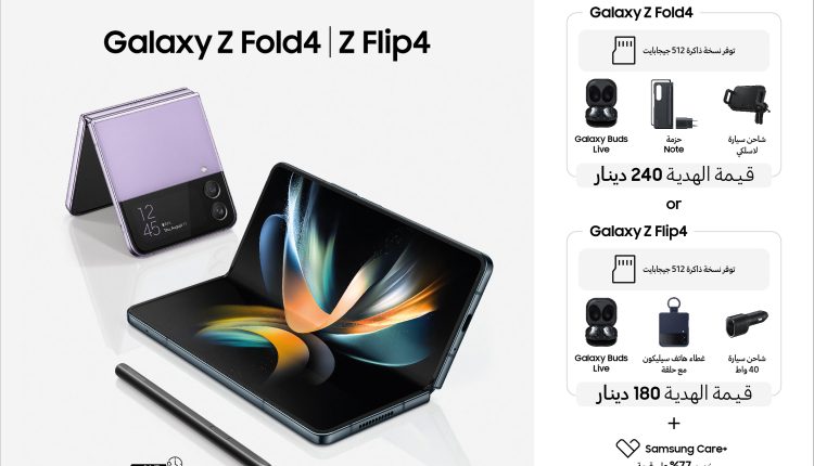وبهذه المناسبة، ستكافئ سامسونج مشتري هواتفها الجديدة القابلة للطي Galaxy Z Fold 4 من أصحاب الطلب المسبق، بحزمة مكونة من سماعة Galaxy Buds Live، وغطاء هاتف يحتوي على قلم سامسونج S Pen مع محول الطاقة للسفر، وشاحن سيارة لاسلكي متنقل، بالإضافة إلى إمكانية ترقية الذاكرة الداخلية لغاية 512 جيجابيت، فيما سيحظى من يشتري هاتف Galaxy Z Flip 4 من أصحاب الطلب المسبق بحزمة مكونة من سماعة Galaxy Buds Live، وغطاء سيليكون للحماية، بالإضافة إلى شاحن سيارة متنقل بقوة 40 واط، مع إمكانية ترقية الذاكرة الداخلية لغاية 512 جيجابيت. وإثراءً لعرضها المميز، تقدم سامسونج خصماً تصل نسبته لغاية 77% على تكلفة إصلاح أعطال الشاشة لأول مرة عند شراء أي من الهاتفين.