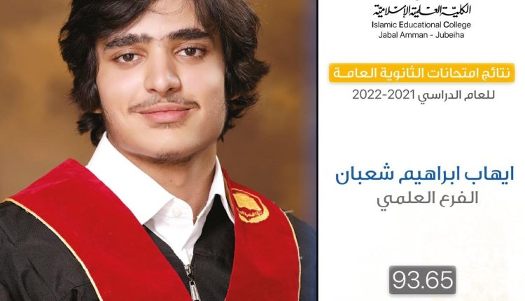 يتقدم الاستاذ المحامي ابراهيم شعبان – عضو مجلس أمناء جامعة عمان الاهلية – وكافة أفراد عائلته من ابنهم البار ايهاب بأحر التهاني والتبريكات بمناسبة نجاحه وبتفوق لافت في امتحان الثانوية العامة للعام الدراسي 2021-2022 – الفرع العلمي – بمعدل (93.65).