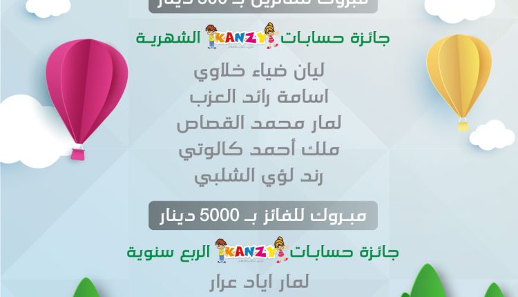 ووفقاً لنتائج السحب، فازت كل من الطفلة ليان خلاوي، والطفلة لمار القصاص، والطفلة ملك كالوتي، والطفلة رند الشلبي، فضلاً عن فوز الطفل أسامة العزب بجائزة الحساب الشهرية البالغة قيمتها 500 دينار، والتي أضيفت لرصيد كل منهم، في الوقت الذي حظيت فيه المدخرة الطفلة لمار عرار بـ5 آلاف دينار كجائزة ربع سنوية.