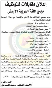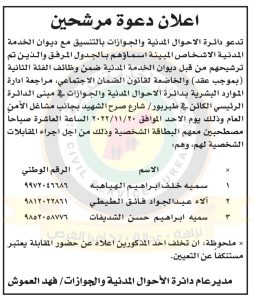 حصاد نيوز _ دعا ديوان الخدمة المدنية بالتعاون مع مختلف الوزارات والمؤسسات الحكومية، التالية اسماؤهم لاجراء المقابلات الشخصية وعقد الامتحان التنافسي لغايات التعيين.