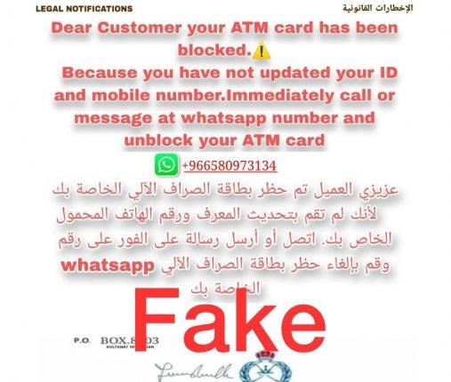 ووأوضحت، أن مرسل ذلك الرابط الوهمي يطلب من المتلقي الدخول واستكمال تعبئة بياناته لوجود نقص فيها وأنه في حال لم يقم بادخال البيانات، سيتم ايقاف بطاقاته الائتمانية والمحافظ المالية الخاصة به، وتشتمل هذه البيانات على معلومات شخصية كرقم الحساب والأرقام والمعلومات السرية، وكود التأكيد الذي يصله كرسالة نصية، ما يمكنهم من اختراق حسابات الضحية، والحصول على امواله إن وجدت عن طريق اجراء التحويلات المالية والشراء الإلكتروني وغيرها من المعاملات المالية.