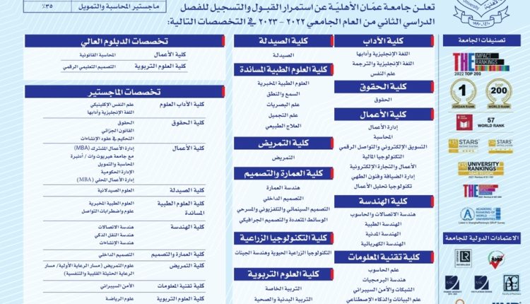 حصاد نيوز _ تعلن جامعة عمان الأهلية عن استمرار القبول والتسجيل للفصل الدراسي الثاني من العام الجامعي 2022 – 2023 في التخصصات التالية :