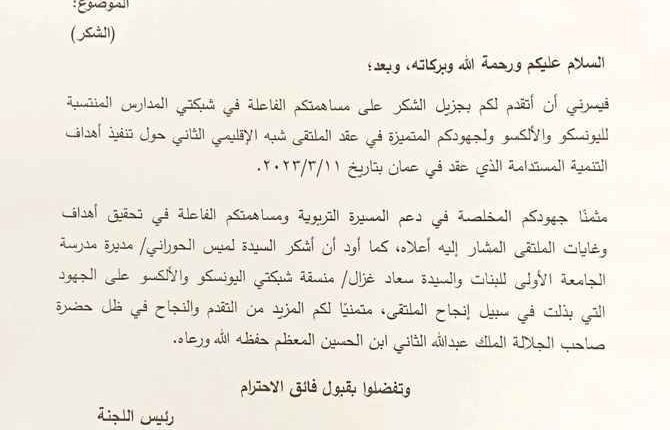 حصاد نيوز _ وجه وزير التربية والتعليم أ.د. عزمي محافظة كتاب شكر خاص باسم السيدة ناديا الحوراني / المشرف العام لمجموعة مدارس الجامعة ، اثنى فيه على مساهمة مدارس الجامعة الفاعلة في شبكتي المدارس المنتسبة لليونسكو والالكسو وجهودها الفاعلة في عقد الملتقى الاقليمي الثاني حول تنفيذ أهداف التنمية المستدامة الذي عقد في عمان بتاريخ 11-3-2023.