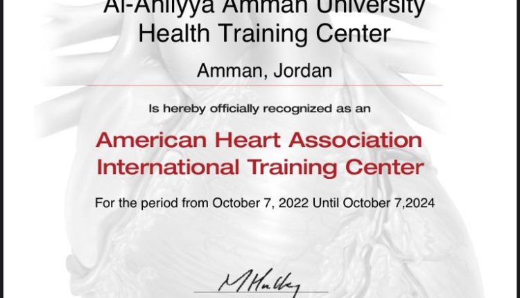 على موافقة وزارة التعليم العالي لعقد دورات متخصصة في التعليم الصحي، وهو المركز الأول في الأردن المعتمد لجمعية القلب الامريكية