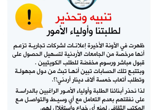 حصادنيوز- حذر المكتب الثقافي الكويتي في الأردن من التعامل مع أي وسيط والتواصل مع المكتب لمنع أي خداع واستغلال للطلبة بعد ظهور إعلانات لشركات تجارية تزعم أنها مرخصة من الجامعات الأردنية.