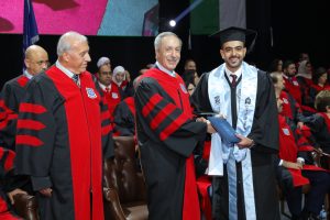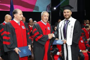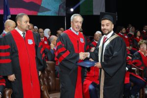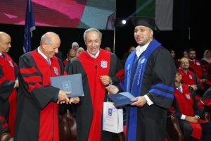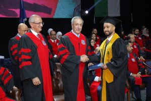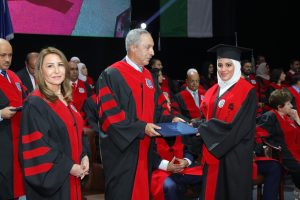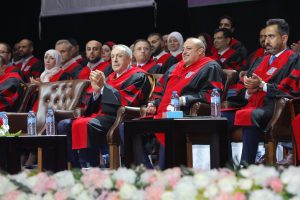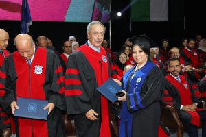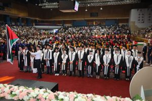 · ثم قام الاستاذ الدكتور أنس السعود نائب الرئيس لشؤون العلاقات الدولية والجودة بتلاوة بيان التخريج .