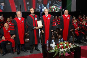 · تلا ذلك قيام راعي الحفل والى جانبيه د.ماهر الحوراني وأ.د.ساري حمدان بتكريم اثنين من الاساتذة المتميزين في مجال البحث العلمي وهما :