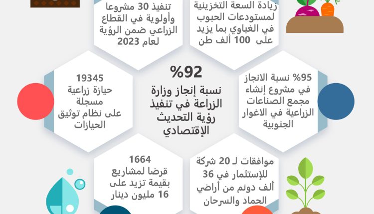 وقال “إن نسبة الإنجاز في مشروع إنشاء مجمع الصناعات الزراعية في الأغوار الجنوبية بلغ 95 بالمئة، وإن عدد الحيازات الزراعية المسجلة على (النظام الرقمي) بلغ 19345 حيازة حتى نهاية 2023.