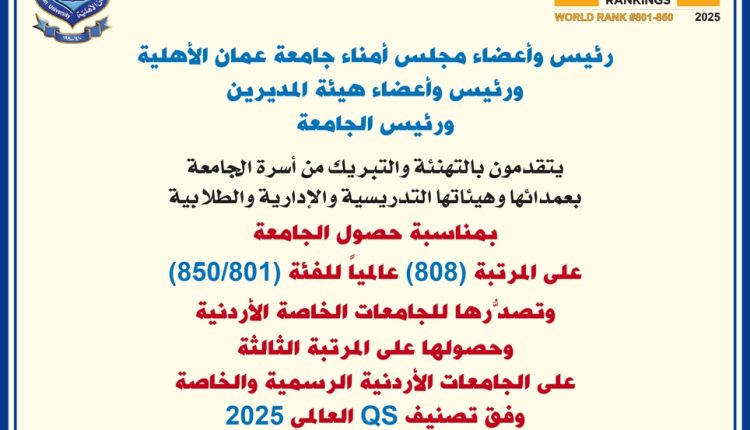 بمناسبة حصول الجامعة على المرتبة (808) عالميا للفئة ( 801 / 850 ) وتصدُّرها للجامعات الخاصة الأردنية