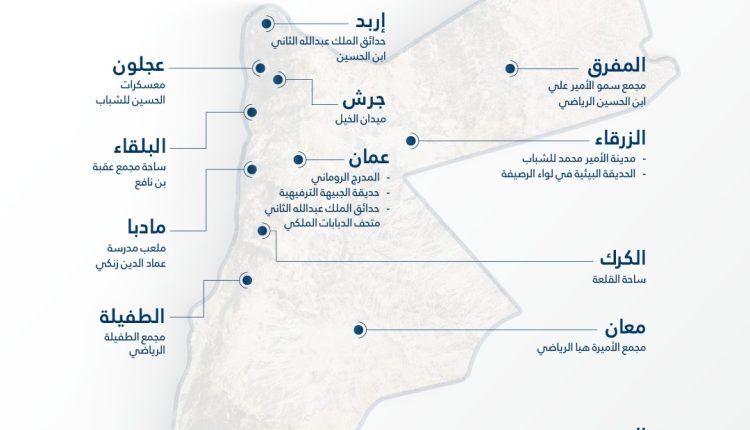 وستُقام هذه الفعاليات في عدد من المواقع في المحافظات على مدار يومين باستثناء العقبة التي ستسمر فيها الأنشطة لثلاثة أيام، وعلى النحو الآتي: حديقة الجبيهة الترفيهية، والمدرج الروماني، وحدائق الملك عبد الله الثاني – متحف الدبابات في العاصمة عمان، وحدائق الملك عبد الله الثاني ابن الحسين في إربد، وميدان الخيل في جرش، وملعب مدرسة عماد الدين زنكي في مادبا، وساحة مجمع عقبة بن نافع في البلقاء، والحديقة البيئية في لواء الرصيفة، ومدينة الأمير محمد للشباب في الزرقاء، ومعسكرات الحسين للشباب في عجلون، وساحة القلعة في الكرك، ومجمع سمو الأمير علي بن الحسين الرياضي في المفرق، ومجمع الطفيلة الرياضي في الطفيلة، وساحة الثورة العربية الكبرى في العقبة، ومجمع الأميرة هيا الرياضي في معان.