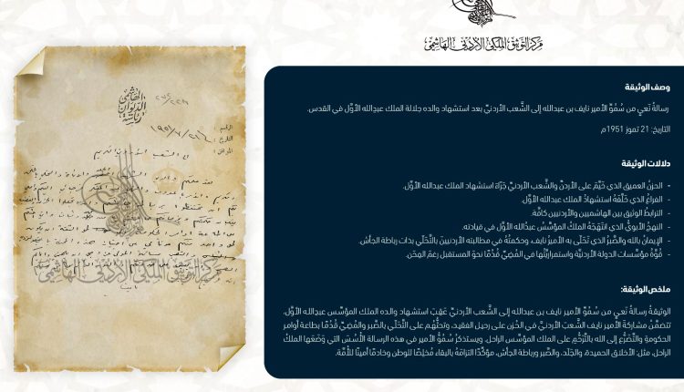 حصادنيوز – عرض مركز التوثيق الملكي الأردني الهاشمي، وثيقة في ذكرى استشهاد الملك المؤسس عبدالله الأول ابن الحسين الموافق يوم غد، الـ20 من تموز، تحتوي رسالة نعي كتبها سمو الأمير نايف بن عبدالله إلى الشعب الأردني، يعبر فيها عن حزنه العميق على رحيل والده الفقيد.