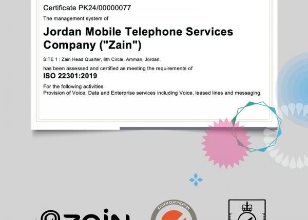 ومُنحت شركة زين الأردن شهادة الآيزو ISO 22301:2019 نظراً لالتزامها بالمعايير الدولية الموصى بها، ووضع الضوابط واتخاذ الإجراءات اللازمة للتعامل مع الكوارث والمخاطر لاستمرارية عمل الشبكة وسرعة إرجاع الخدمة بذات الجودة، والعمل على تقليل احتمالية حدوثها وتخصيصها بكفاءة عالية لمواجهة ومعالجة التحديات، والقدرة على الاستجابة بفاعلية وفي وقت قصير أثناء حالات الطوارئ لضمان استمرارية أعمالها والخدمات المُقدّمة للزبائن بذات الجودة.