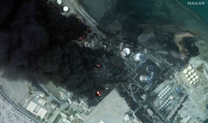 وأظهرت صور أقمار اصطناعية عالية الدقة التقطتها شركة “ماكسار تكنولوجيز” ألسنة اللهب تلتهم منطقة تخزين الوقود المتضررة بشدة في الميناء.
