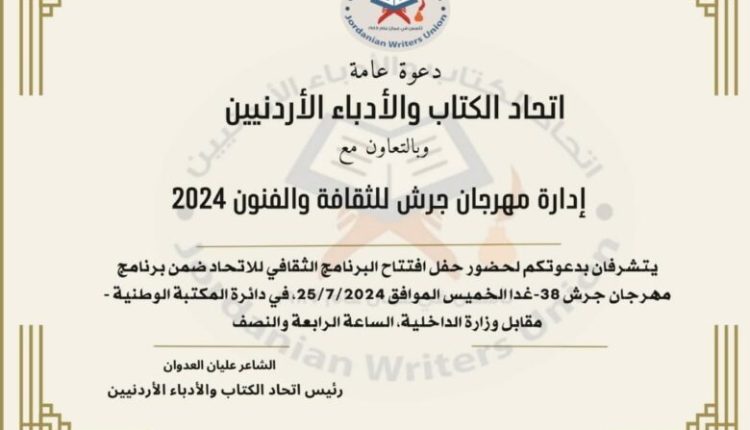 حصادنيوز – اتحاد الكتاب والأدباء، وبالتعاون مع إدارة مهرجان جرش للثقافة والفنون 2024، يتشرفان بدعوتكم لحضور حفل افتتاح البرنامج الثقافي للاتحاد ضمن فعاليات الدورة 38 للمهرجان.