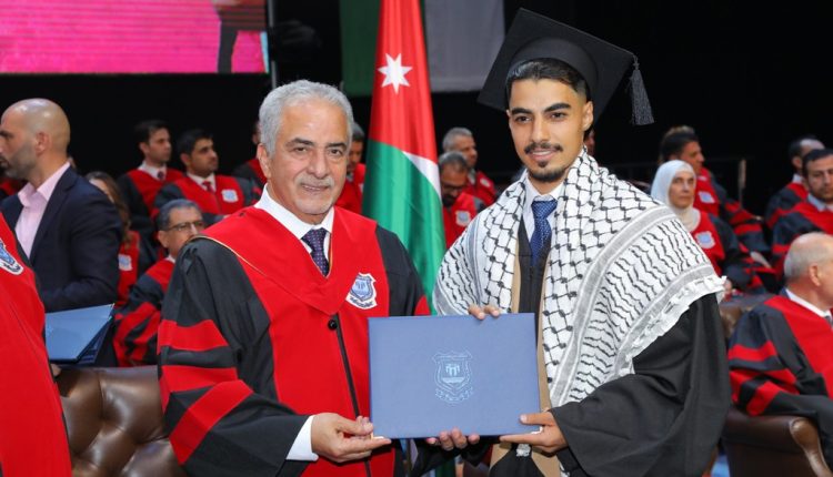 وأشاد بالطلبة الخريجين من الرياضيين المتميزين الذين حققوا انجازات مشرفة للجامعة بقوله : إنه لمن دواعي سرورنا أن نحتفل اليوم بتخريج كوكبة من طلابنا الرياضيين المتميزين والذين ساهموا في تحقيق إنجازات مشرفة للجامعة. لقد أثبتم بجدارتكم ومثابرتكم أن الرياضة والتعليم وجهان لعملة واحدة، وأن التفوق ليس حكراً على القاعات الدراسية بل يمتد إلى ميادين الرياضة. نبارك لكم هذه النجاحات، ونعبر عن فخرنا واعتزازنا بكم ونبعث من خلالكم اطيب الامنيات لبطلنا الغائب الحاضر خريج هذا الفوج من كلية العلوم التربوية تخصص التربية البدنية والصحية الطالب زيد مصطفى محمود عبدالكريم والذي لم يكتفي بالتميز الأكاديمي فقط، بل تجاوز حدود الجامعة ليصبح سفيراً لجامعتنا ووطننا في كبرى المحافل الرياضية الدولية، من خلال تمثيله للمملكة الأردنية الهاشمية في دورة الألعاب الأولمبية المقامة حالياً في العاصمة الفرنسية باريس، متمنين لبطلنا التوفيق والنجاح في رفع راية الوطن خفاقة واعتلاء منصة التتويج.