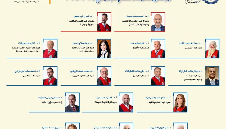 ** أسرة جامعة عمان الأهلية تبارك لمجلس العمداء الجديد وتتمنى له التوفيق والنجاح.