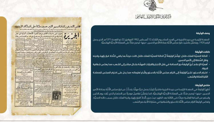 وأوضح المركز في بيان اليوم الأحد، أن الوثيقة تبرز خبرًا رئيسًا عن قرار مجلس الأمَّة بمناداة الأمير الحسين آنذاك ليصبح ملكًا على الأردن، نظرًا لحالة والده الصحيّة؛ الملك طلال.