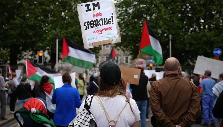 ورفع المتظاهرون لافتات كتبوا عليها “أوقفوا الإبادة”، و”النكبة لم تنته”، كما وضعوا مجسمات لأطفال ملفوفة بالقماش الأبيض على الأرض تجسيدا للأطفال الرضع الضحايا في غزة.