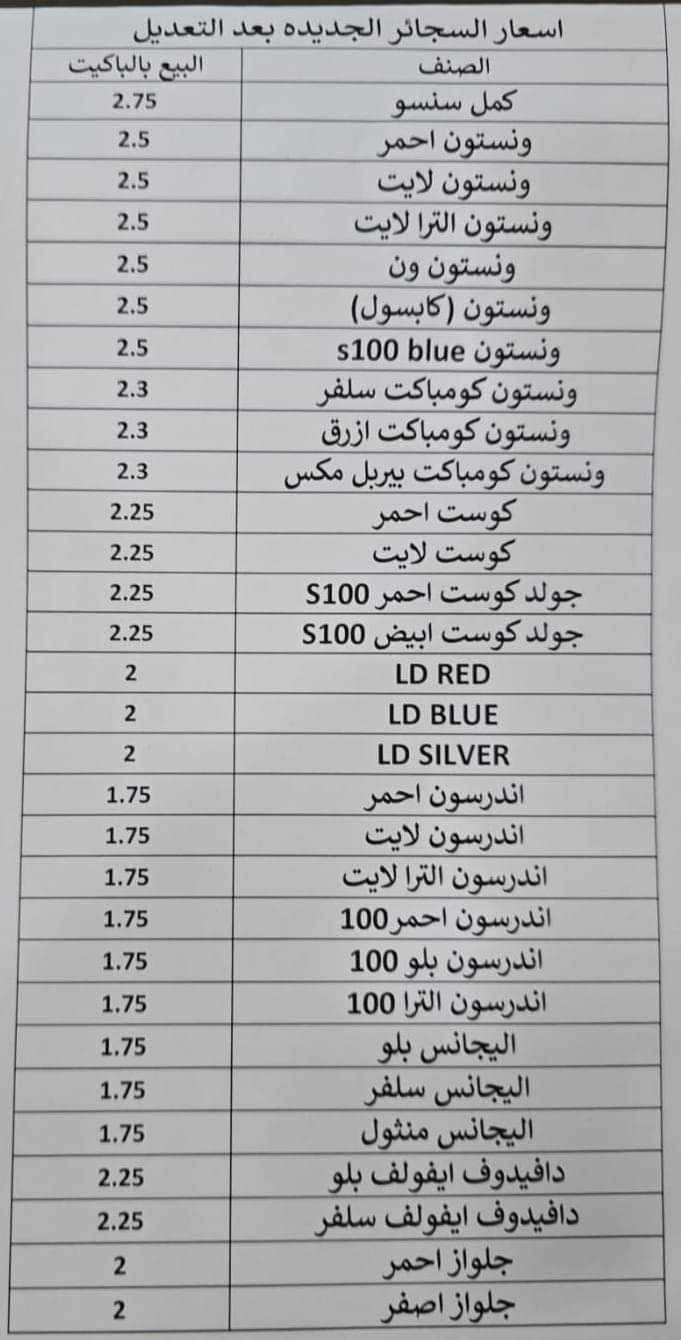 وحصل موقع الوكيل الاخباري على نسخة من التسعيرة التي يتداولها أصحاب المحال، تبين رفع أسعار الدخان 25 قرشا .