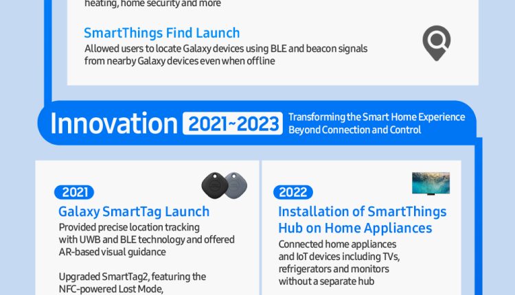 قم بالاطلاع على الرسم البياني أدناه لاستكشاف رحلة SmartThings من سامسونج الغنية بالابتكار، وتعرف على هذا التطبيق الرائد الذي أحدث ثورة في مجال أتمتة المنازل على مدار العقد الماضي.