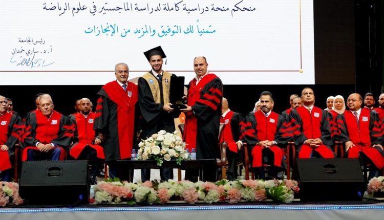 ثم تحدث عن تكريم الجامعة لطلبتها وخريجيها المتميزين حيث قال : تقديراً من الجامعة لطلبتها وخريجيها المتميزين على المستوى الرياضي وتكريماً من هيئة المديرين في جامعة عمان الأهلية لخريج الجامعة والبطل الأولمبي الطالب زيد مصطفى بمناسبة حصوله على الميدالية الفضية في رياضة التايكواندو في أولمبياد باريس 2024 وبناءً على تنسيب رئيس الجامعة قرر رئيس هيئة المديرين عطوفة الدكتور ماهر الحوراني منح الطالب زيد مصطفى منحة كاملة لدراسة الماجستير في علوم الرياضة.