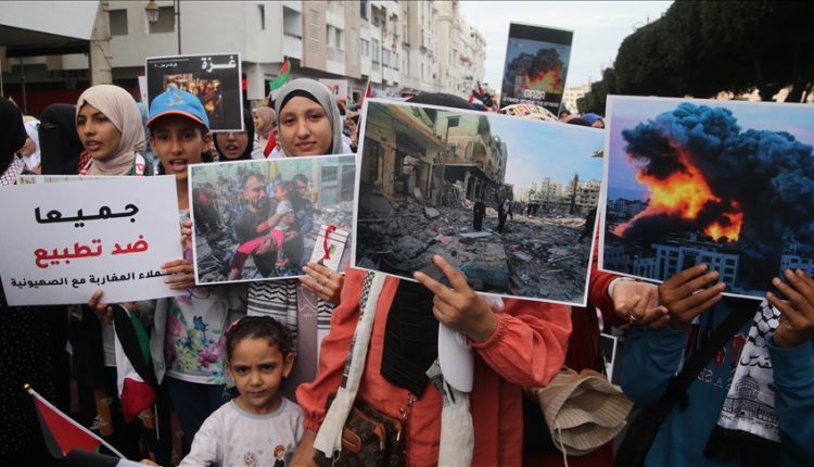 وذكر مراسل الأناضول، أن المحتجين المغاربة رددوا شعارات تشيد بـ”قوى إسناد فلسطين”، وأخرى بالصمود الفلسطيني.