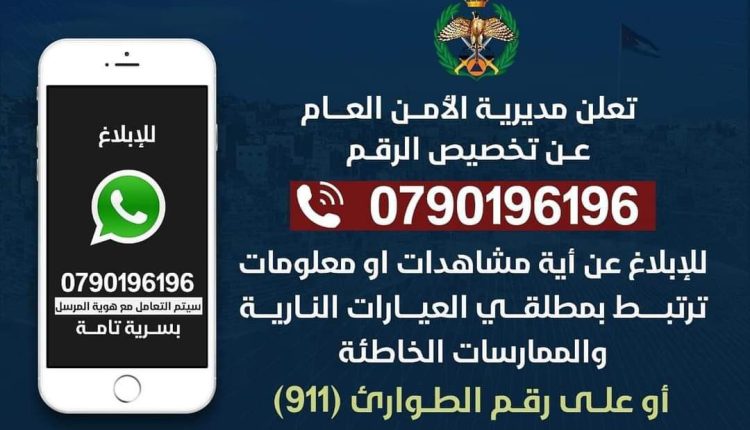 مديرية الأمن العام تخصص رقم خاص لمطلقي العيارات والممارسات الخاطئة