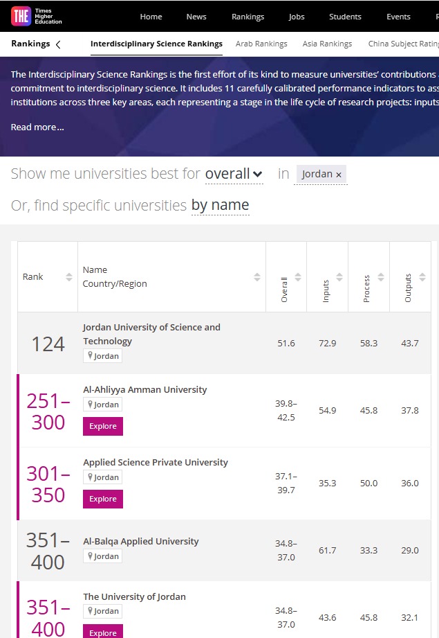 عمان الأهلية الثانية محلياً على الجامعات الاردنية بتصنيف التايمز لجودة البحوث العلمية متعددة التخصصات 2025