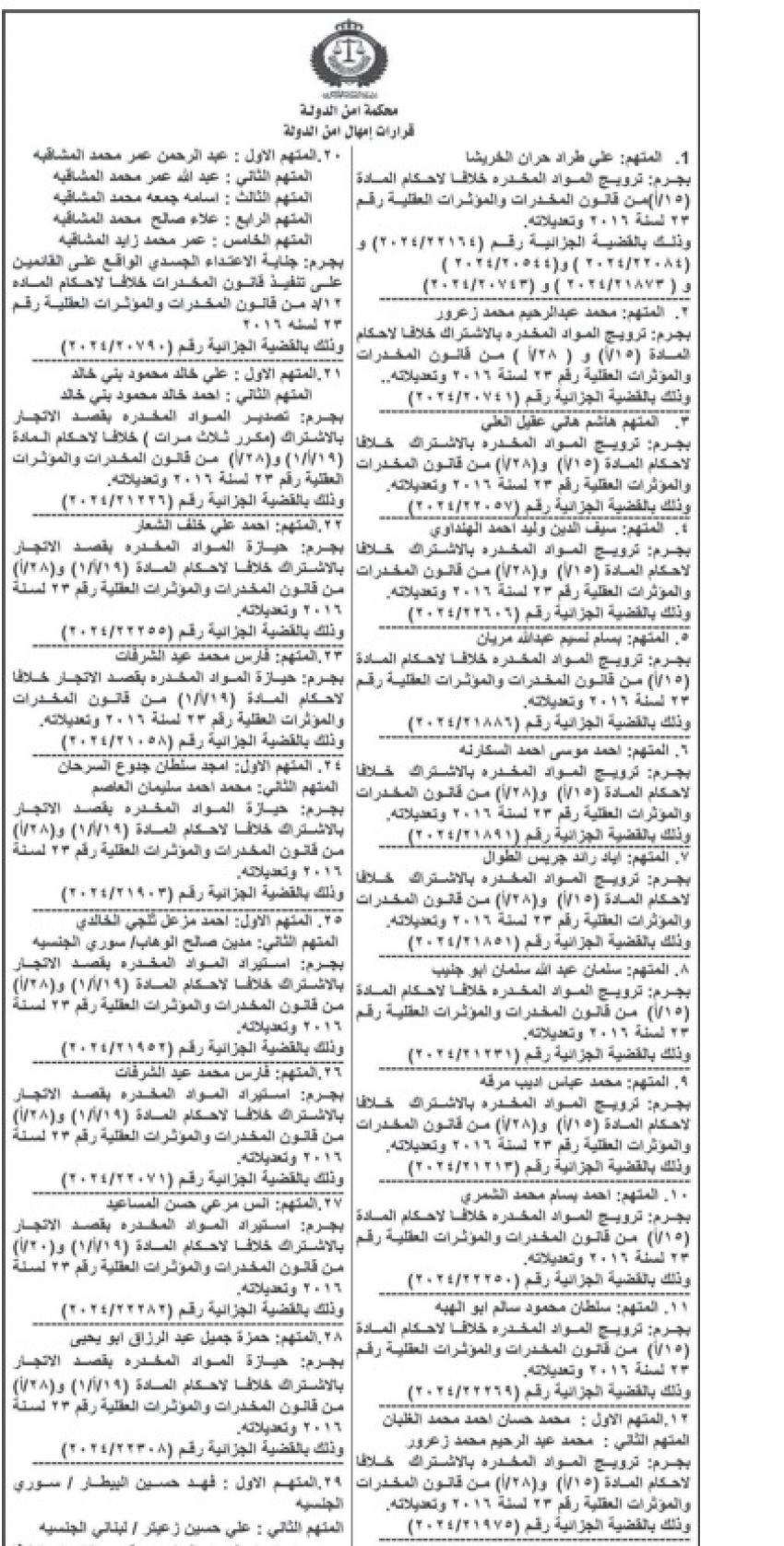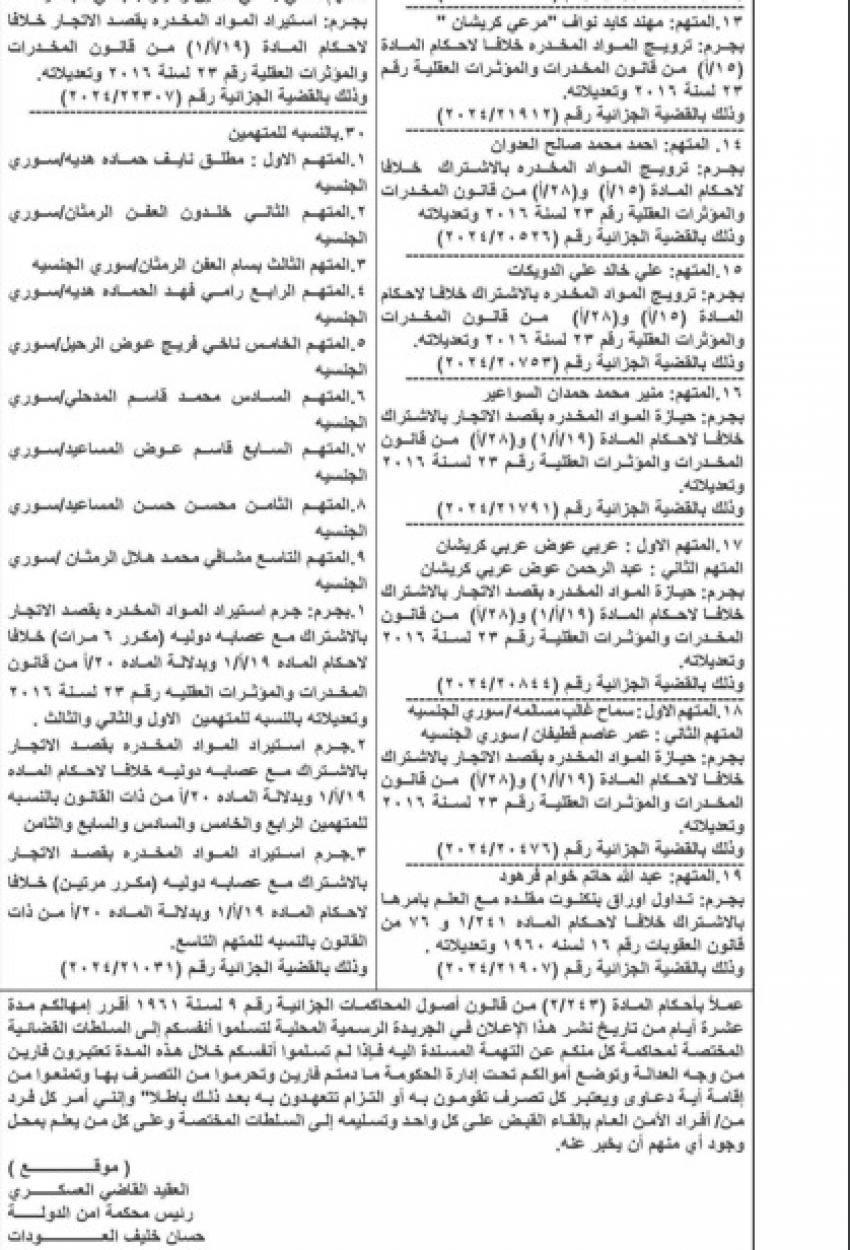 ونشرت المحكمة، أسماء المتهمين، عملا بأحكام المادة 243 /2 من قانون أصول المحاكمات الجزائية رقم 9 لسنة 1961.