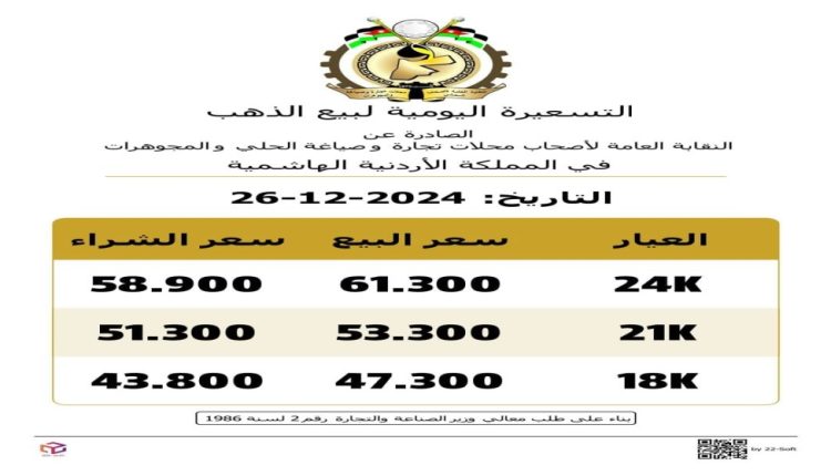 وحسب النشرة اليومية التي تصدرتها النقابة العامة لأصحاب محلات تجارة وصياغة الحلي والمجوهرات، بلغ سعر الغرام الواحد من الذهب عياري 24 و18 لغايات البيع من محلات الصاغة، عند 61.30 و 47.30 دينارا على التوالي.