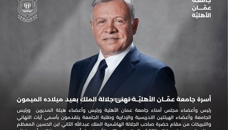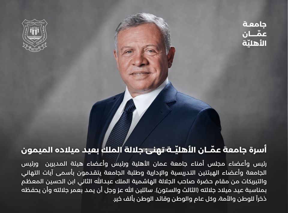أسرة جامعة عمّان الأهلية تهنئ جلالة الملك بعيد ميلاده الميمون