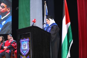 · وألقت كلمة الخريجين والخريجات الطالبة سمية نعيم حمد خليفات من كلية الدراسات العليا رحبت فيها براعي الحفل وبرئيس هيئة المديرين وبرئيس الجامعة وبالعمداء والاساتذة والحضور وبزملائها الخريجين والخريجات .