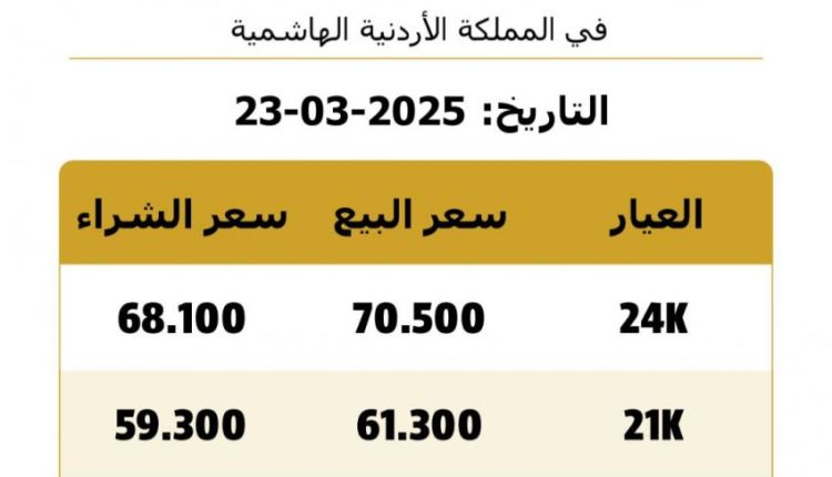 وبلغ سعر بيع غرام الذهب عيار 21 عند 61.3 دينارًا لغايات البيع في محالّ الصاغة، مقابل 59.3 دينارًا للشراء.