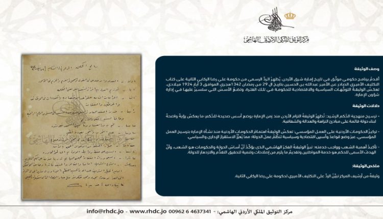 حصادنيوز – عرض مركز التوثيق الملكي الأردني الهاشمي، وثيقة من أرشيفه تمثل أقدم برنامج حكومي موثق، الذي يتضمن رد حكومة علي رضا الركابي الثانية على كتاب التكليف الأميري.