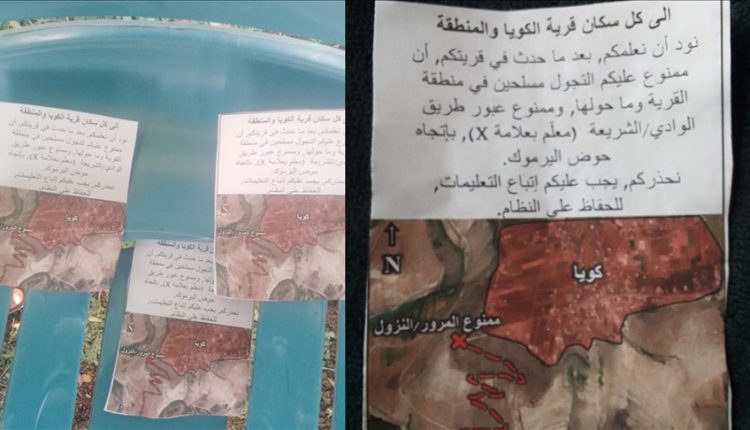 وأفاد مراسل الأناضول نقلا عن شهود عيان في البلدة، بأن طائرات إسرائيلية ألقت على كويّا منشورات ورقية تحذر فيها من “تجول المسلحين في القرية وما حولها، وعبور طريق الوادي/ الشريعة المؤدي إلى حوض اليرموك”.