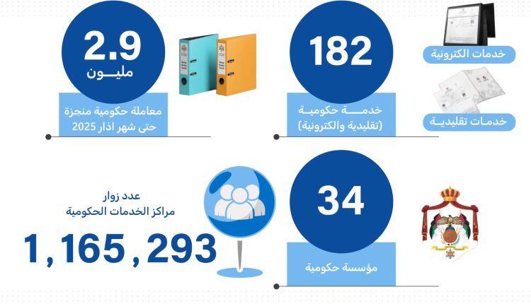 حصادنيوز – بلغ إجمالي المعاملات التي تم إنجازها من خلال مراكز الخدمات الحكومية الشاملة حتى آذار الماضي 2.9 مليون معاملة.