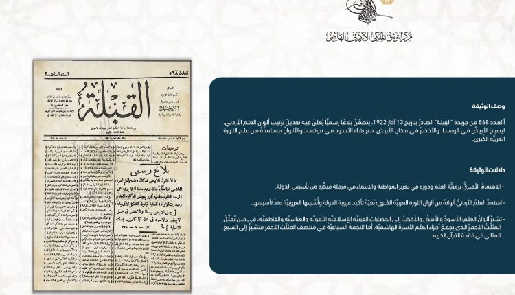 حصادنيوز – عرض مركز التوثيق الملكي الأردني الهاشمي بمناسبة ذكرى يوم العلم الأردني، الذي يصادف السادس عشر من نيسان وثيقة من أرشيفه تظهر العدد 568 من جريدة “القبلة” الصادرة بتاريخ 13 آذار 1922.