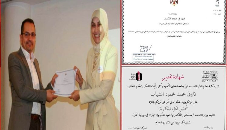 و قد سلمت الجائزة عطوفة الامين العام لوزارة الصحة الدكتورة الهام خريسات خلال حفل افتتاح فعاليات اليوم العلمي الاول للجودة و سلامة المرضى.
