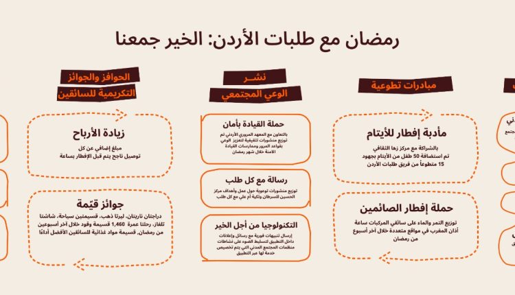 وفي سياق متصل، فقد نظمت “طلبات” الأردن فعاليات تطوعية متعددة بشكل منفرد وأخرى من خلال شراكاتها المجتمعية؛ وذلك لتحقيق أهداف إنسانية واجتماعية عكست معها التزامها بتعزيز قيم التكافل وروح المبادرة لخدمة الآخرين، إلى جانب رفع مستوى السلامة المرورية التي تشكل أهمية قصوى لديها.