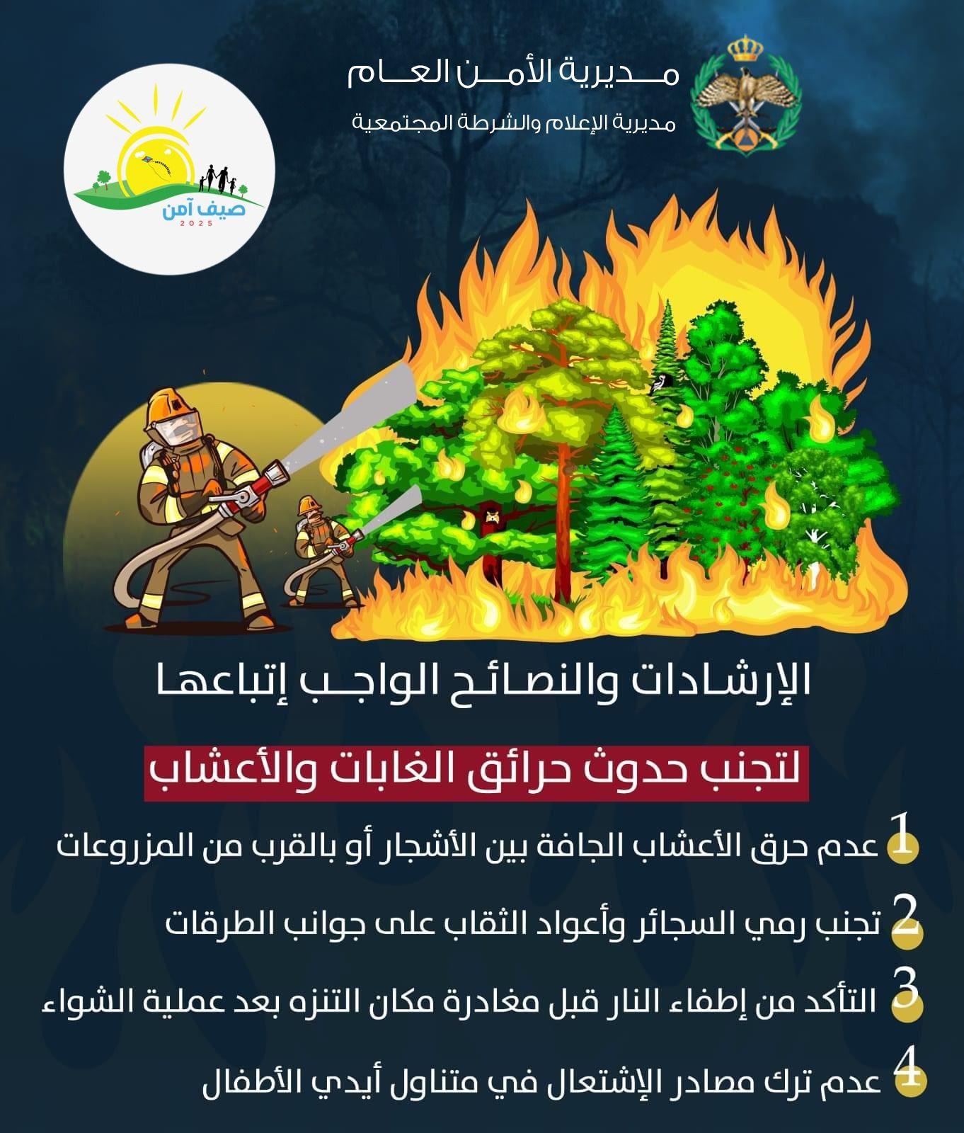 مديرية الأمن العام تحذر من خطر الحرائق وتدعو إلى حماية المواقع الطبيعية